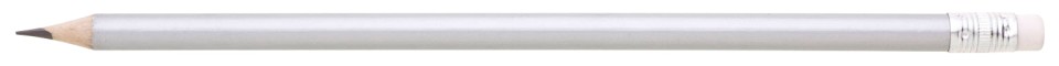 Kulatá, stříbrná, dřevěná, grafitová tužka HB s bílou gumou, hrocená.