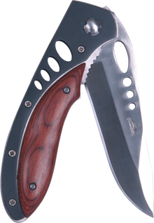 Čepel vyrobena z kvalitní oceli 440 s bezpečnostní pojistkou, dřevěná