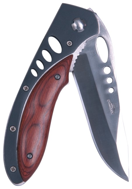 Čepel vyrobena z kvalitní oceli 440 s bezpečnostní pojistkou, dřevěná