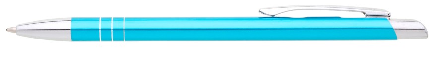 Tenká kovová propiska SOTTI v tyrkysové barvě s chromovými doplňky a třemi tenkými proužky. Náplň X-20, modře píšící.