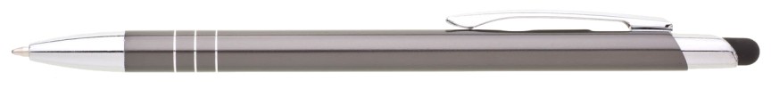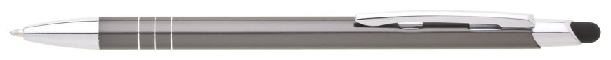 Tenká kovová propiska SOTTI s touch koncem v šedé barvě s chromovými doplňky a třemi tenkými proužky. Náplň X-20, modře píšící.