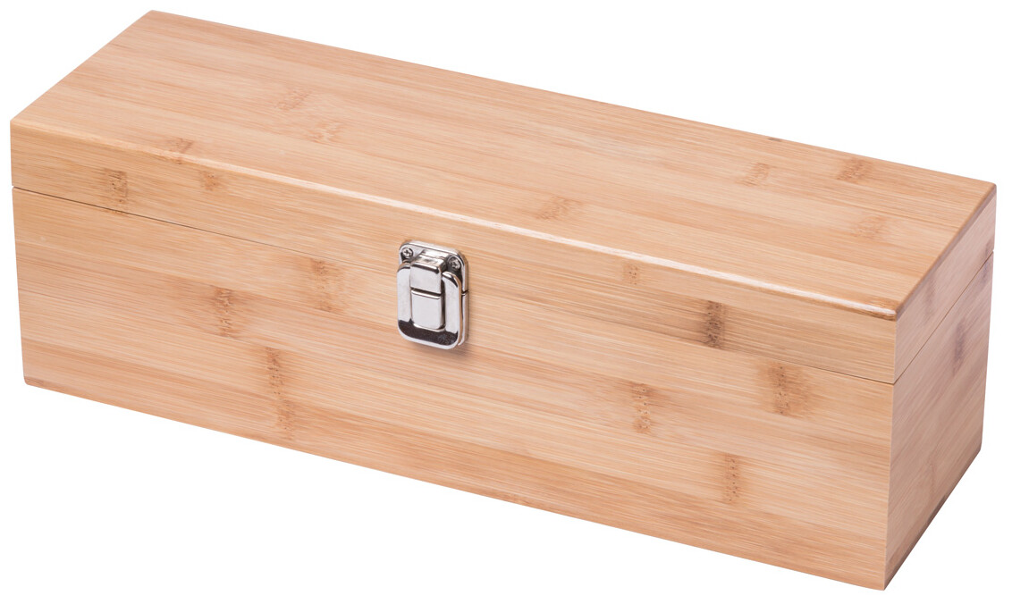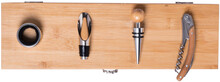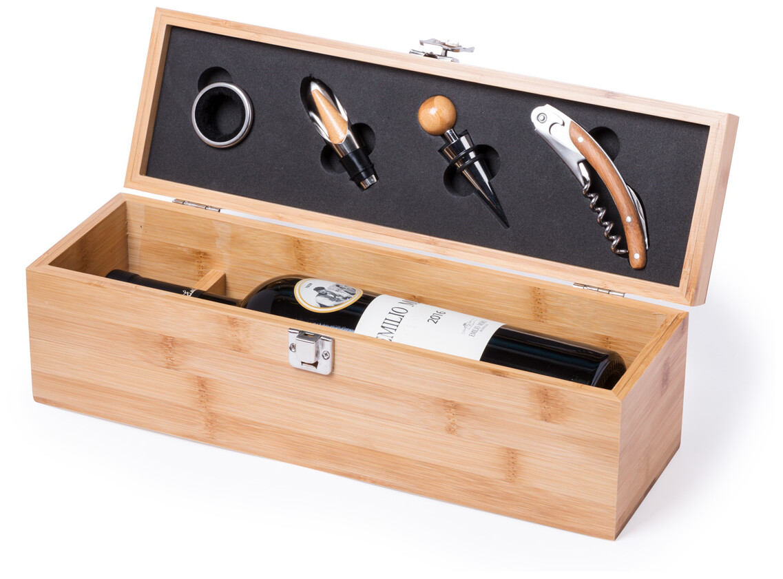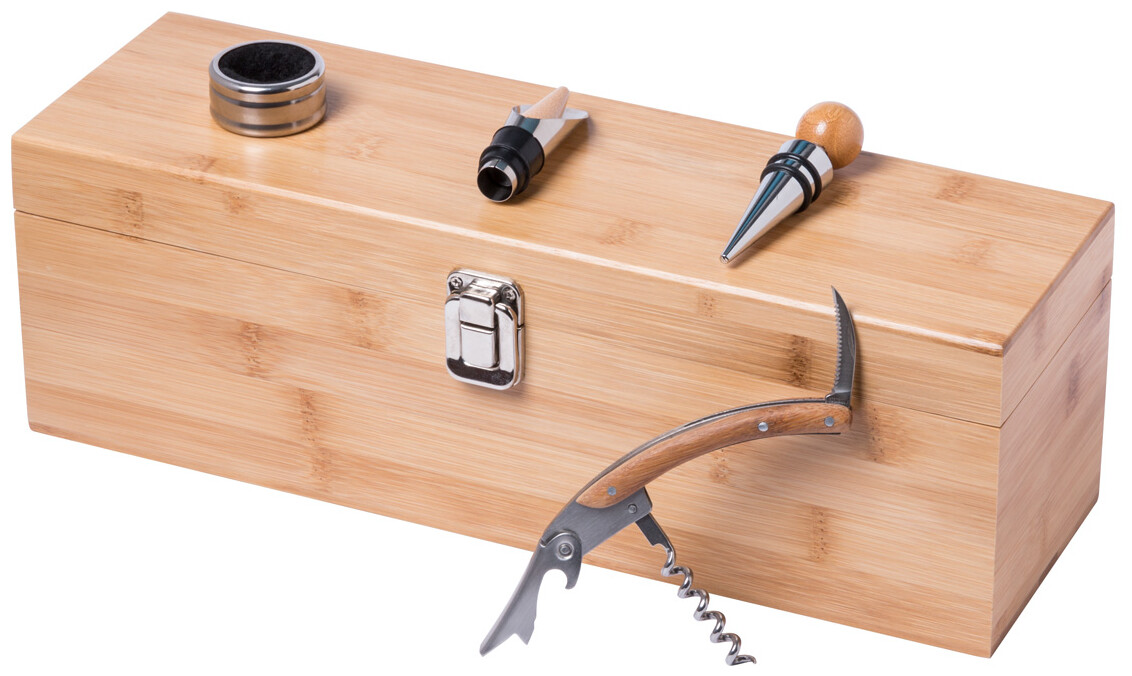 Sada na víno z bambusu s vývrtkou, kroužkem, nálevku a zátkou v bambusové krabičce s přihrádkou na láhev vína. Dodáváno bez láhve.