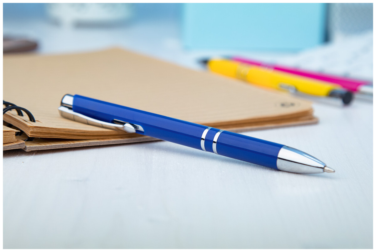 Plastové kuličkové pero s lesklým klipem a špičkou, s modrou náplní.