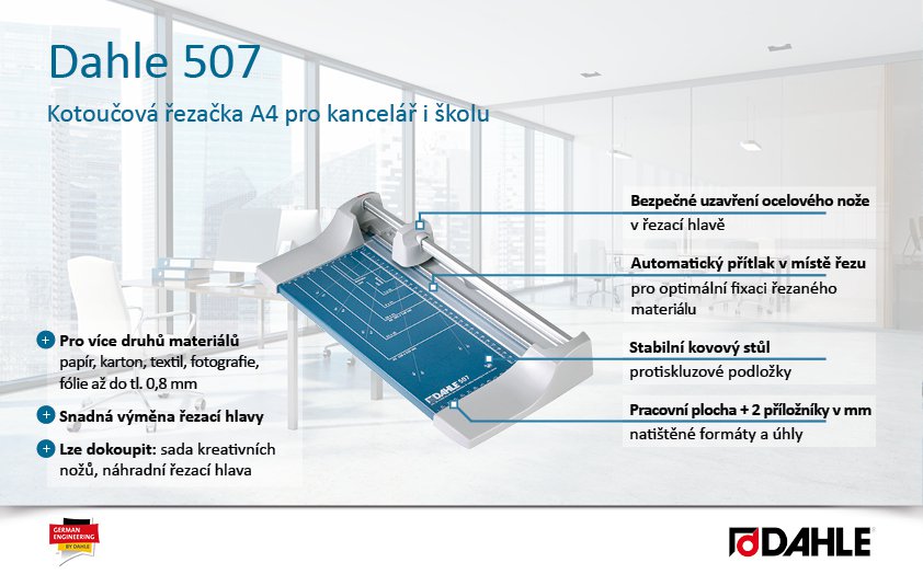 Bezpečná kotoučová řezačka pro běžné použití v kanceláři i škole. Ostrý kotoučový nůž a spodní nůž zaručují přesný řez. Uzavřená hlava nože zajišťuje vysokou míru bezpečnosti. Snadná výměna řezací hlavy. Automatický přítlak v místě řezu pro optimální fixaci řezaného materiálu. Stabilní kovový stůl s neklouzavými pryžovými podložkami pro komfortní provoz. Dva příložníky pro přesný řez 90°. Natištěné úhly a DIN formáty - užitečné formátování na stole s dělením v mm, usnadňují přesné vyrovnání řezaného materiálu. Lze dokoupit: sada kreativních nožů pro model 507 se 3 hlavami pro dekorační řezy - vlnitý, nepravidelný a perforace, náhradní řezací hlava. Váha: 1 kg. Rozměr stolu: 440 x 211 mm. Délka řezu: 320 mm. Výška řezu: 0,8 mm. DIN: A4. Řezný výkon: 8 listů papíru (80 g/m2).