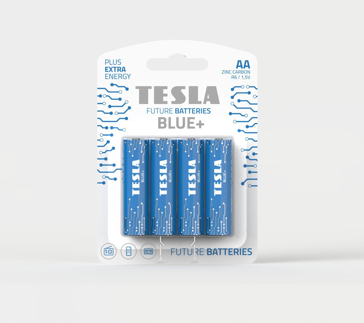 Řada TESLA BLUE+ zahrnuje zinko-uhlíkové baterie se základním napětím 1,5 V. Tyto baterie typu AA jsou vhodné především do zařízení s krátkodobým odběrem nízkého množství proudu, například do televizních ovladačů, budíků, časovačů či nástěnných hodin. Hlavním benefitem této řady je její cenová dostupnost a dlouhá výdrž.