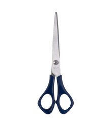 Nerezové kancelářské nůžky symetrické rukojeti potažené černým plastem. Délka čepele 8 cm, celková délka 16 cm.