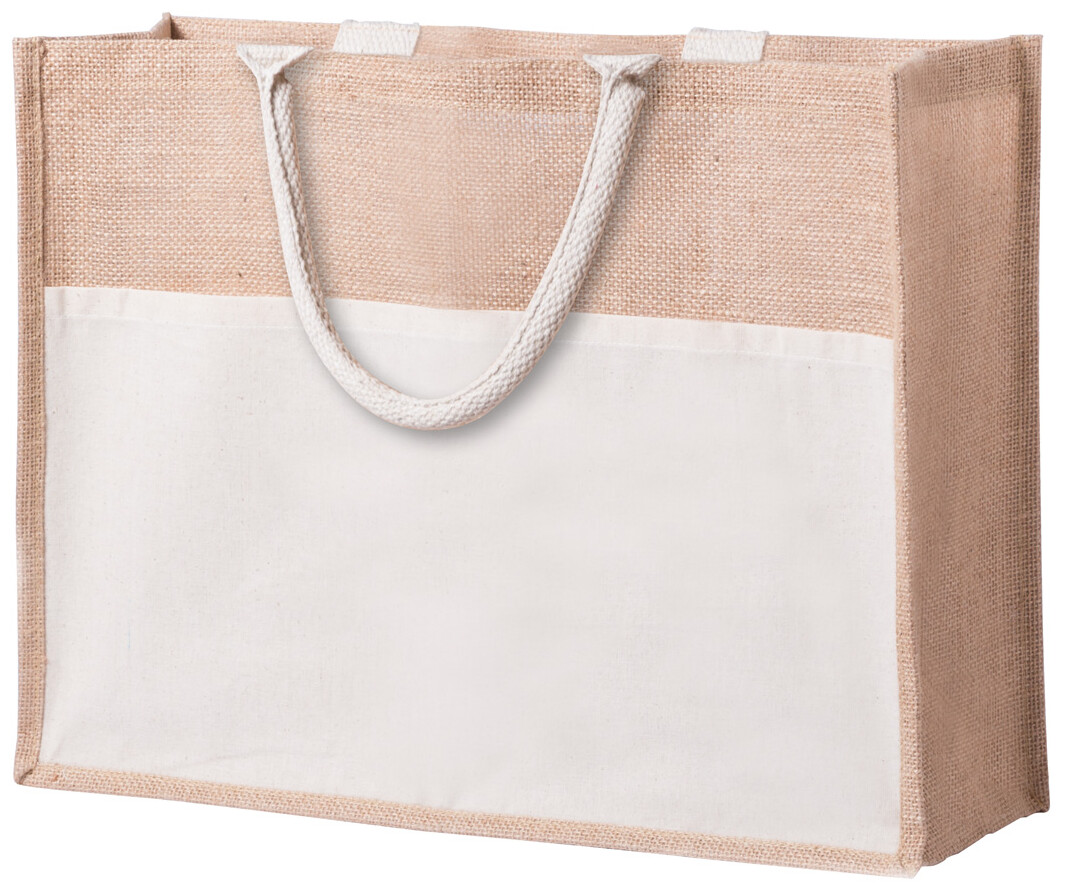 Plážová taška z laminované juty s bavlněnými uchy a přední kapsou.