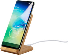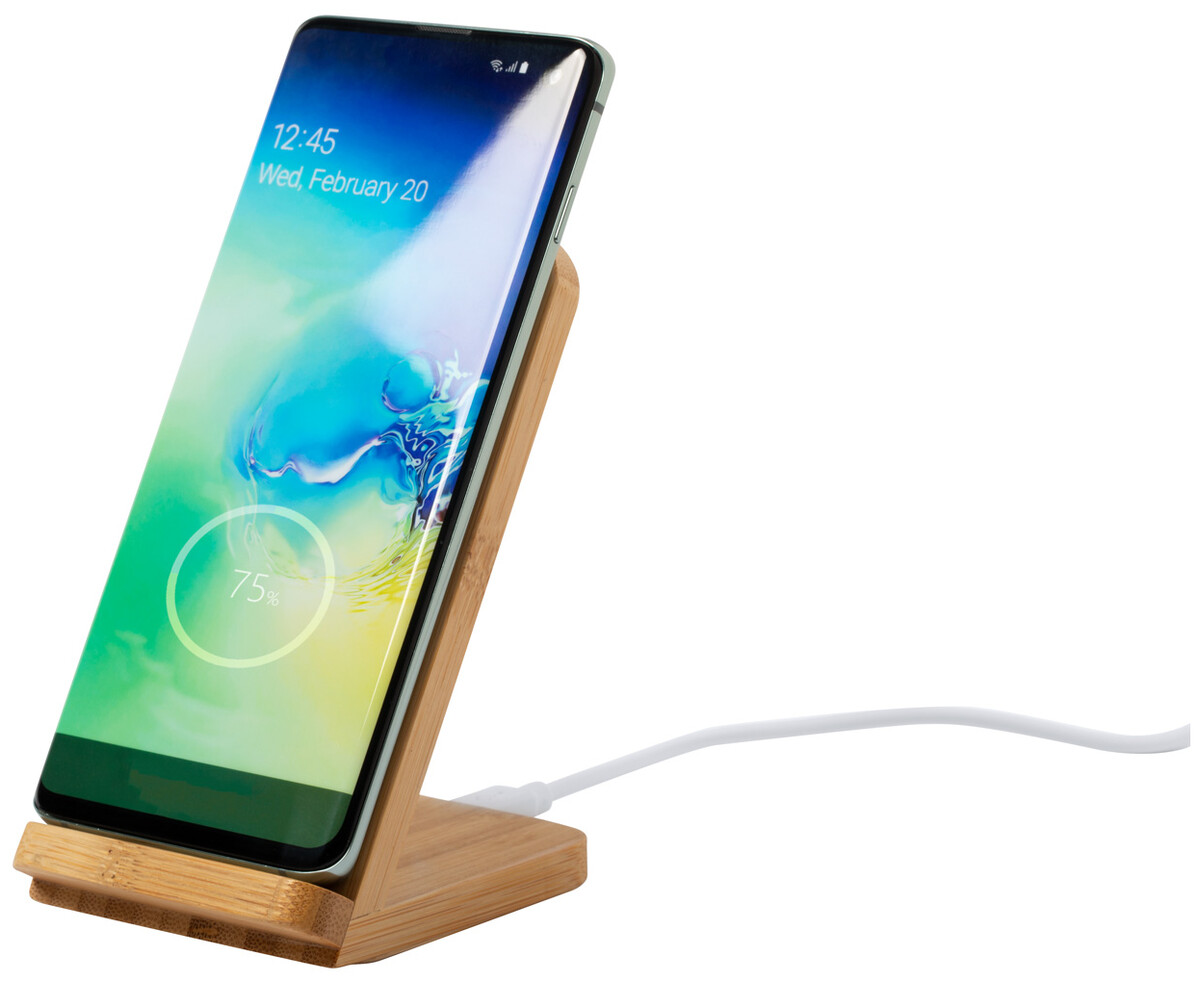 Stojánek na mobil z bambusu s vestavěnou bezdrátovou nabíječkou (10W). Včetně nabíjecího USB kabelu.