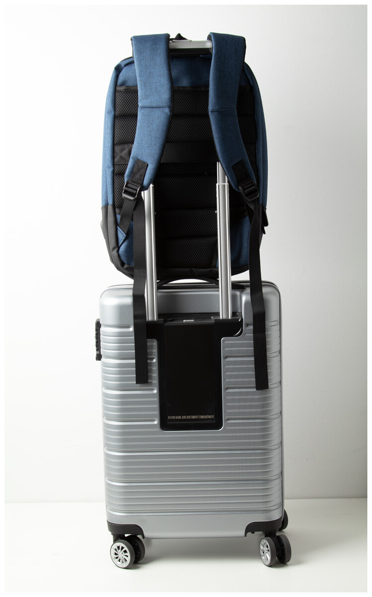 Dvoubarevný batoh s více přihrádkami na zip, uvnitř mnoho kapes, s polstrovanou přihrádkou na notebook (17 "), ergonomickými zády a ramenním popruhem. S kapsou na ochranu proti krádeži, popruh na vozík a vestavěné připojení USB pro power banky. 400D polyester.