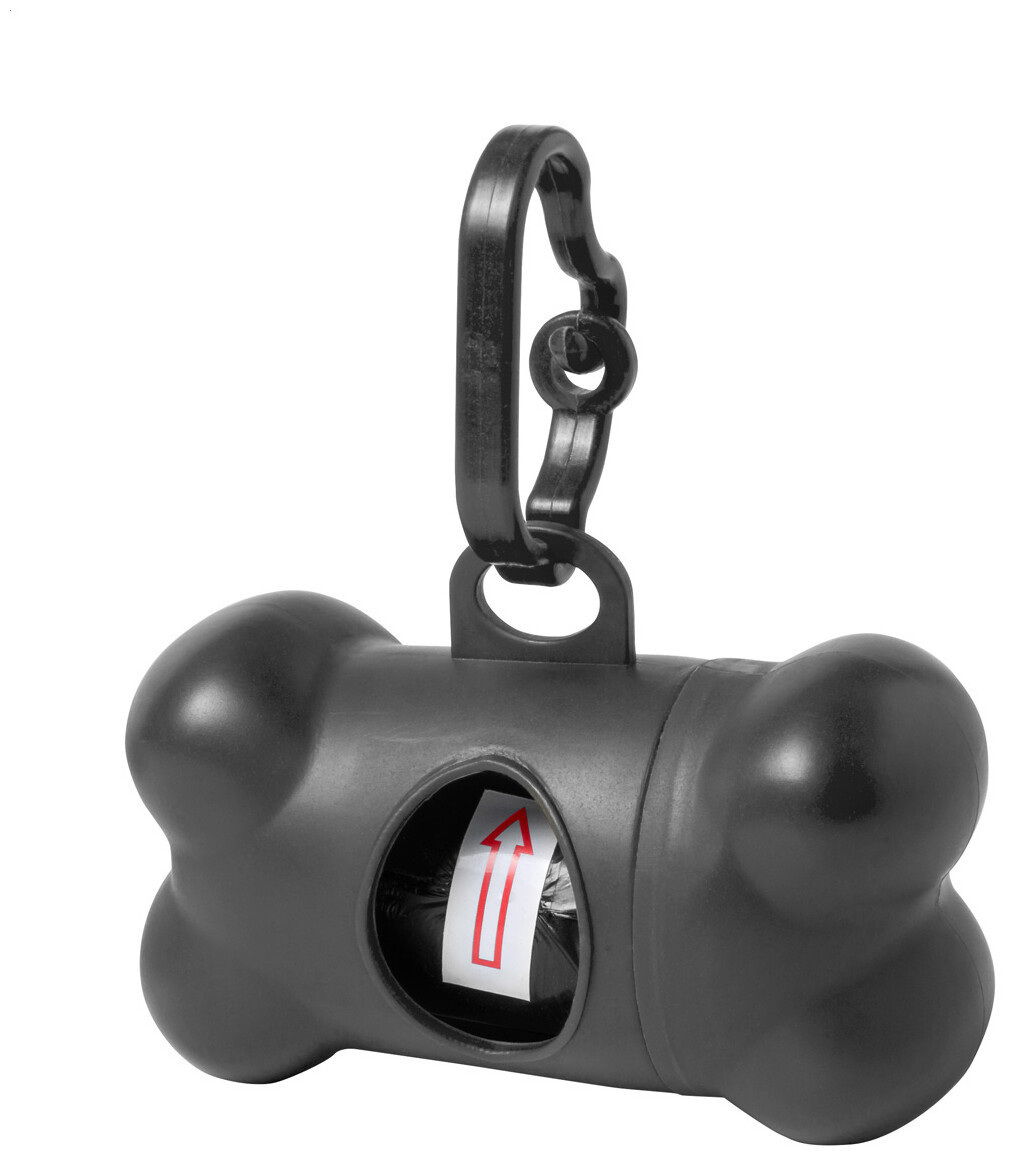 Plastový zásobník ve tvaru kosti s 15 pytlíky na psí exkrementy s karabinkou.