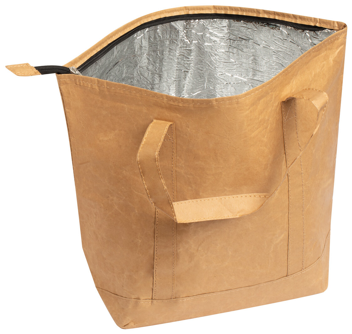 Polaminovaná chladicí taška z recyklovaného papíru na zip s hliníkovým polstrováním a krátkými uchy.