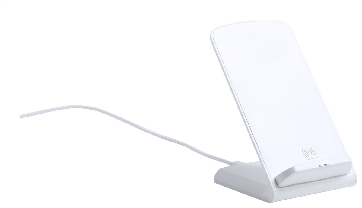 Plastový stojánek na mobilní telefon s vestavěnou bezdrátovou rychlou nabíječkou (10W). Včetně nabíjecího kabelu USB.