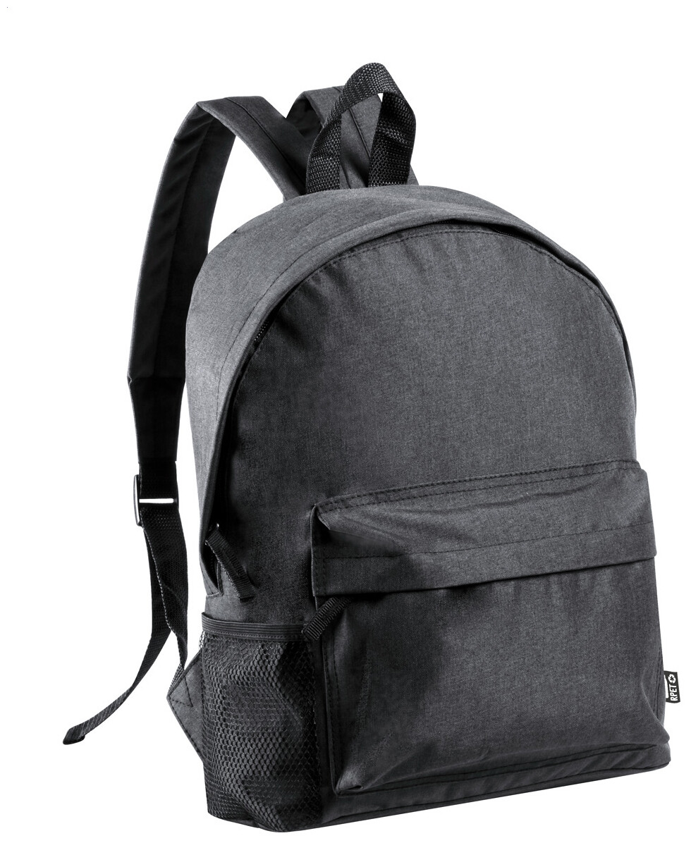 Batoh s přední kapsou na zip, boční kapsou ze síťoviny, polstrovanými zády a ramenními popruhy. 600D RPET polyester, s etiketou s označením RPET.