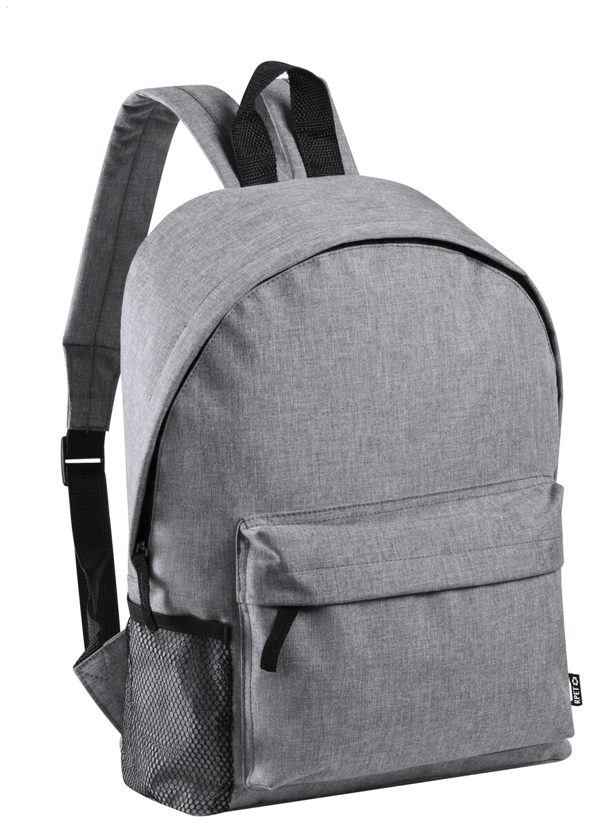 Batoh s přední kapsou na zip, boční kapsou ze síťoviny, polstrovanými zády a ramenními popruhy. 600D RPET polyester, s etiketou s označením RPET.