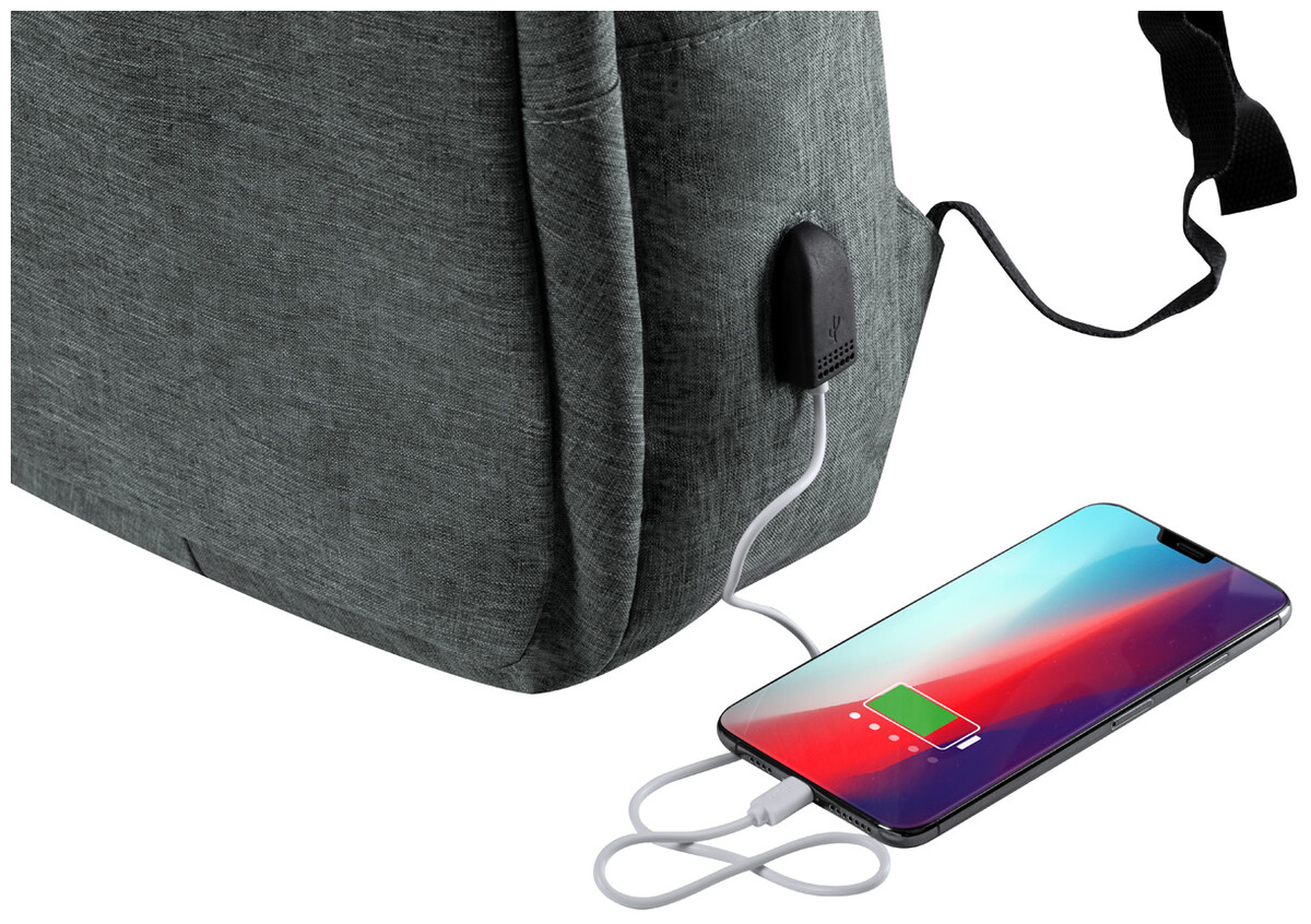 Batoh s přihrádkami na zip, boční kapsou ze síťoviny, polstrovanou přihrádkou na notebook (15 ") a tablet (10"), polstrovanými zády a ramenními popruhy. Se zabudovaným USB připojením pro power banky. Polyester 600D.