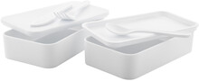 Box na jídlo z antibakteriálního plastu se sadou příborů (vidlička, lžíce a nůž) a elastickým popruhem. Každý má 2 oddíly o objemu 700 ml. V souladu s ISO 22196.