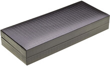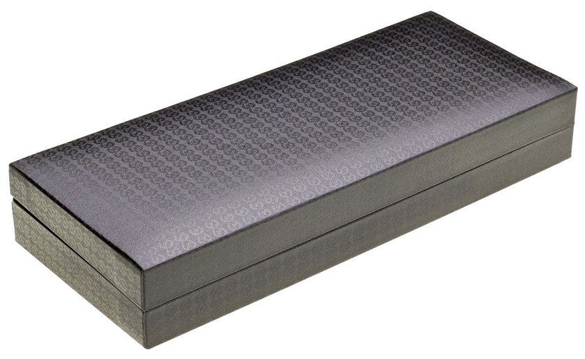 Pouzdro je potažené černou saténovou látkou s drobným vzorkem, vnitřek pouzdra je vyložený černým saténem. Pouzdro je baleno v černé papírové ochranné krabičce.