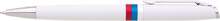 Bílá otočná propiska s trikolórou a tiskem znaku Slovenské republiky. Náplň velkoobsahová, modře píšící.