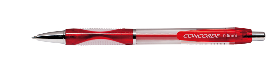 Gelové pero se stiskacím mechanismem a gumovým úchopem. Jednorázové. Průhledné tělo pro optickou kontrolu stavu náplně. Hrot 0,5 mm. Barva náplně: červená.