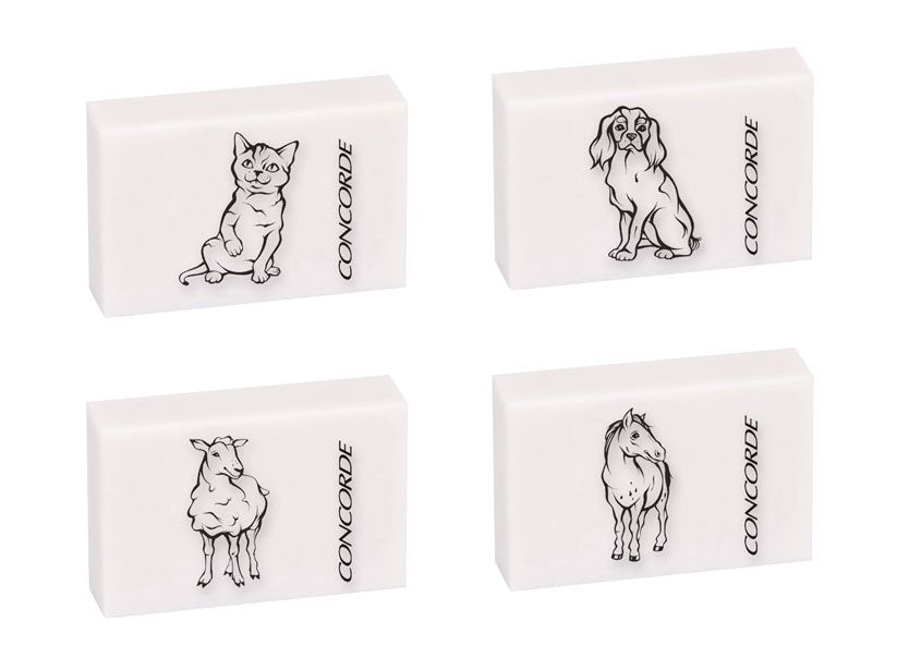 Bílá pryž o rozměrech 3,3 x 2,2 cm, dodávané v mixu 5 různých obrázků zvířátek - žába, kočka, pes, kůň, ovce.
