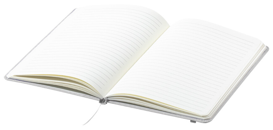 RPET blok A5 potažený polyesterem s 80 linkovanými listy, záložkou a gumičkou.
