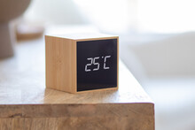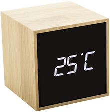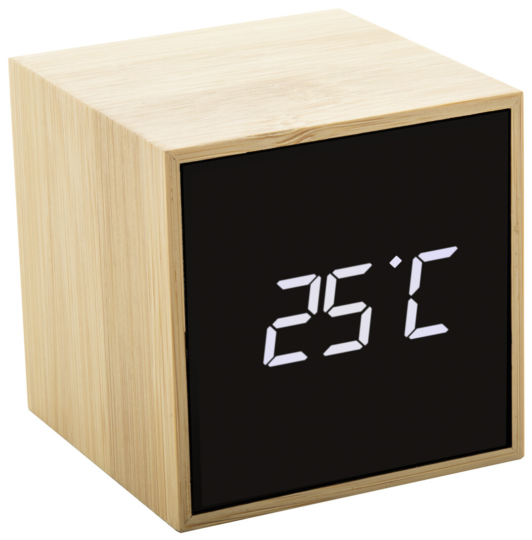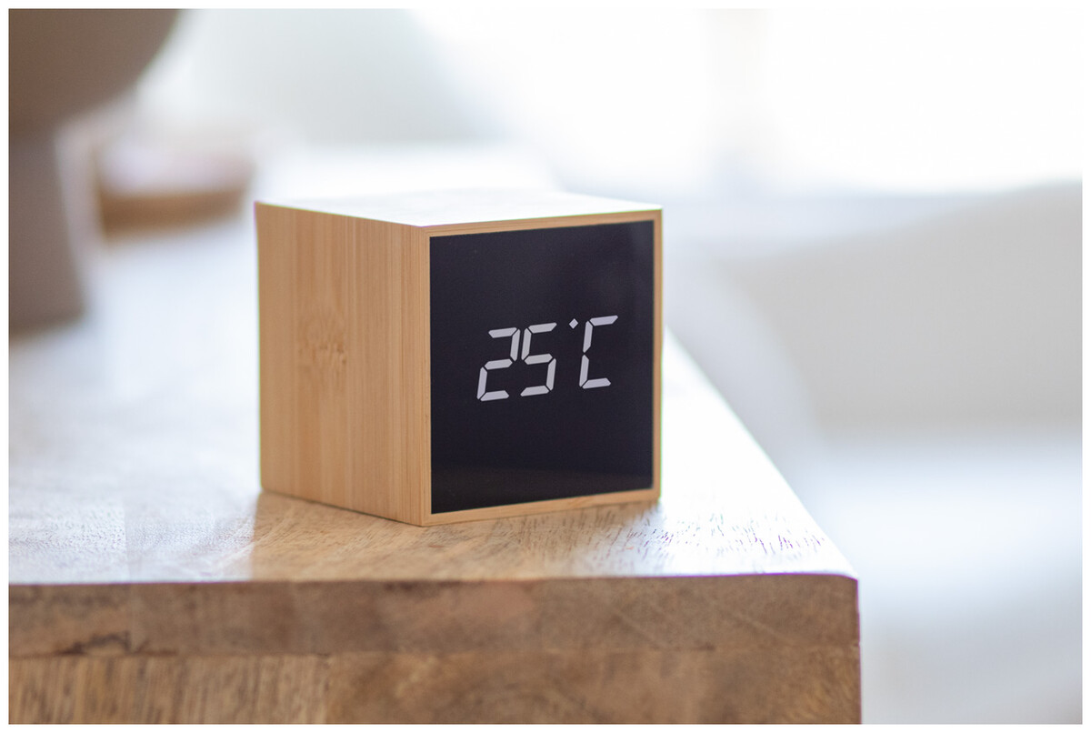 Bambusový, digitální budík a teploměr s bílým LED displejem. Může být napájen pomocí přiloženého nabíjecího kabelu USB nebo pomocí 3 baterií AAA (dodáváno bez baterií).