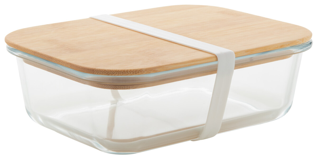 Skleněný box na jídlo s víkem z přírodního bambusu a silikonovým páskem, 800 ml.