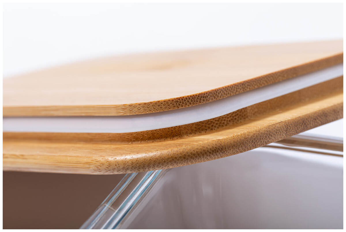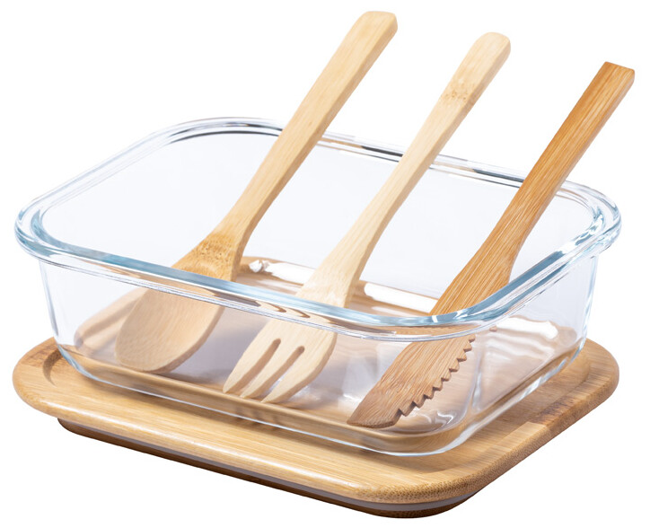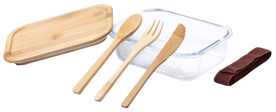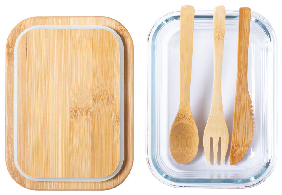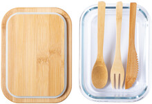 Skleněný box na jídlo s víkem z přírodního bambusu. Se sadou příborů z bambusu (nůž, vidlička a lžíce) a elastickým páskem, 500 ml.