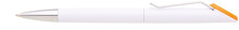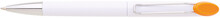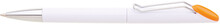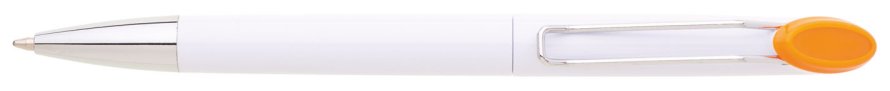 Plastová bílá otočná propiska VERENA s chromovou špičkou a chromovým klipem. Držák klipu je oranžový a je možné na něj umístit epoxy samolepku. Náplň velkoobsahová, modře píšící.