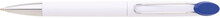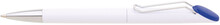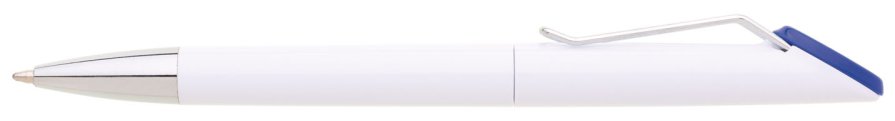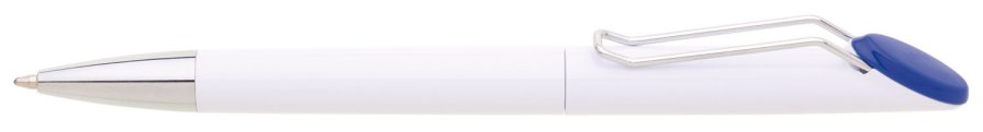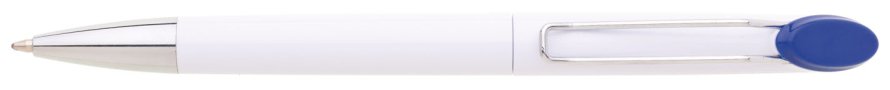Plastová bílá otočná propiska VERENA s chromovou špičkou a chromovým klipem. Držák klipu je modrý a je možné na něj umístit epoxy samolepku. Náplň velkoobsahová, modře píšící.