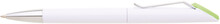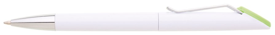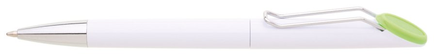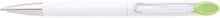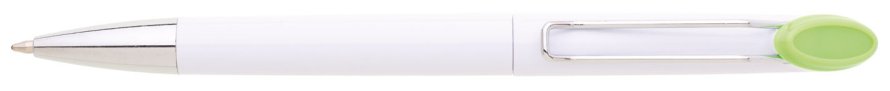 Plastová bílá otočná propiska VERENA s chromovou špičkou a chromovým klipem. Držák klipu je zelený a je možné na něj umístit epoxy samolepku. Náplň velkoobsahová, modře píšící.