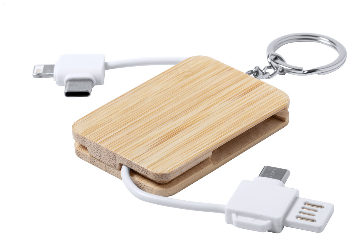 Bambusový přívěšek na klíče s USB nabíjecím kabelem a konektory micro USB, USB-C a Lightning. Se vstupy USB a USB-C.