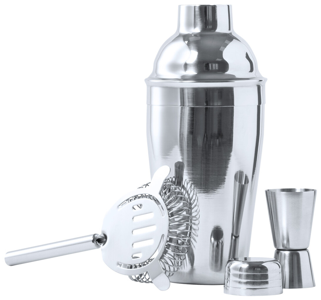Nerezová koktejlová sada s 550 ml šejkrem, odměrkou a koktejlovým sítkem.
