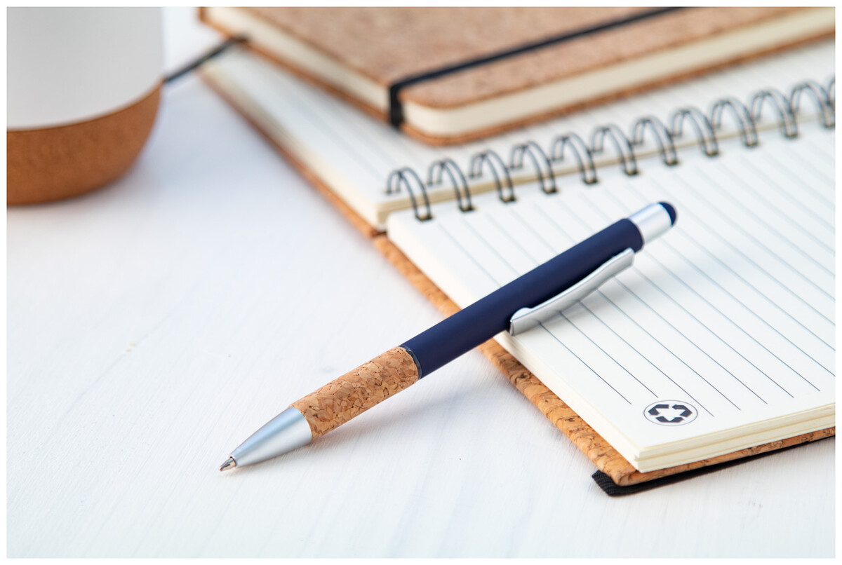Hliníkové kuličkové a dotykové pero s úchopem z přírodního korku, matným povrchem těla a částí. S modrou náplní.