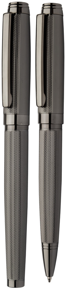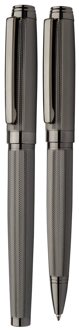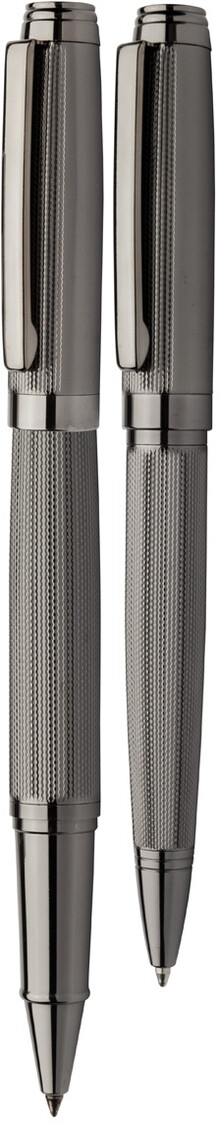 Elegantní sada kovového kuličkového pera a rolleru se vzorovaným tělem. V černé dárkové krabičce, s modrou náplní. Produkt značky André Philippe.