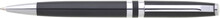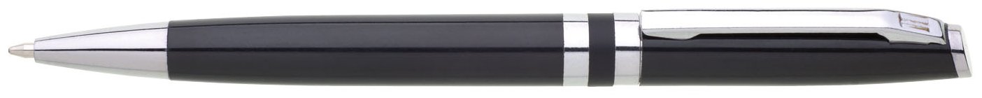 Varianta klasické propisky černé tělo je zdobené dvěma chromovými kroužky. Otočný mechanismus, náplň modře píšící.