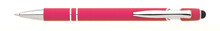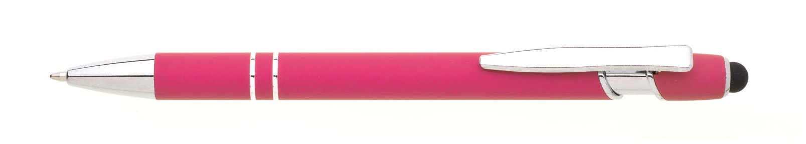 Propiska s touch koncem, měkkým pogumovaným soft povrchem ve růžové barvě a stříbrnými doplňky včetně dvou ozdobných kroužků. (NATIO)