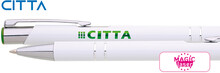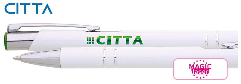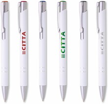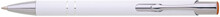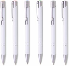 Kovová hliníková propiska s bílým povrchem a barevným lesklým laserem v barvě horního ukončení propisky. Tělo zdobené dvěma stříbrnými proužky. Náplň velkoobsahová, modře píšící.