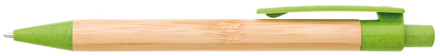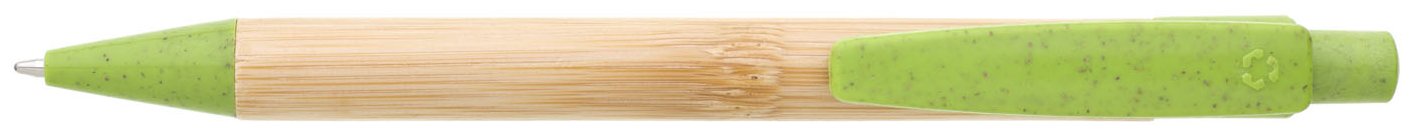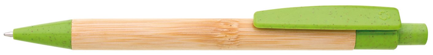 Bambusové tělo propisky s doplňky z plastu s podílem slámy. Náplň modře píšící velkoobsahová.