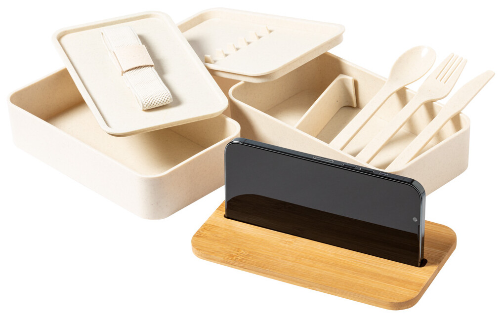 Box na jídlo z PP plastu se sadou příborů (vidlička, lžíce a nůž), bambusovým víkem s držákem na mobilní telefon a elastickým popruhem. Se 2 přihrádkami o objemu 700 ml.