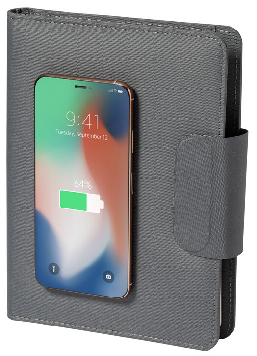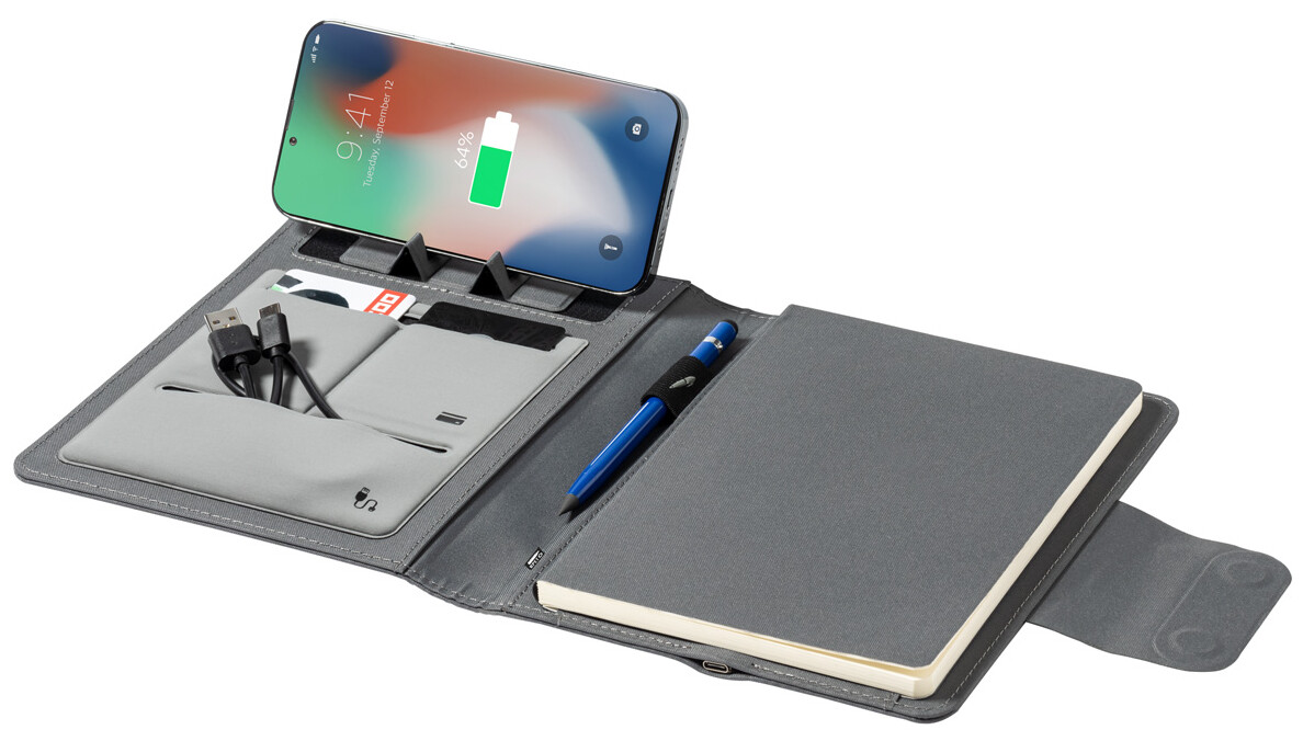 Polyesterová sloha na dokumenty A5 z 300D RPET se zápisníkem na 65 řádků, vestavěnou magnetickou bezdrátovou rychlonabíječkou (10W), power bankou 5000 mAh s portem pro nabíjení USB a skládacím držákem na mobil. Včetně samolepícího kovového kroužku pro použití magnetické funkce na jakémkoli bezdrátově nabíjecím zařízení. Včetně USB nabíjecího kabelu.