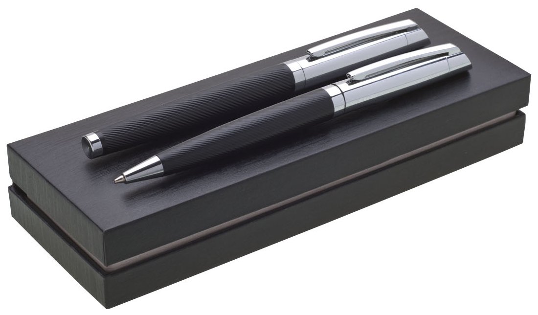 Elegantní sada s propiskou a rollerem Genero v černo-stříbrné kombinaci v dárkové krabičce. Laser na propiskách je šedo-hnědý. Kolekce Gabrielis.