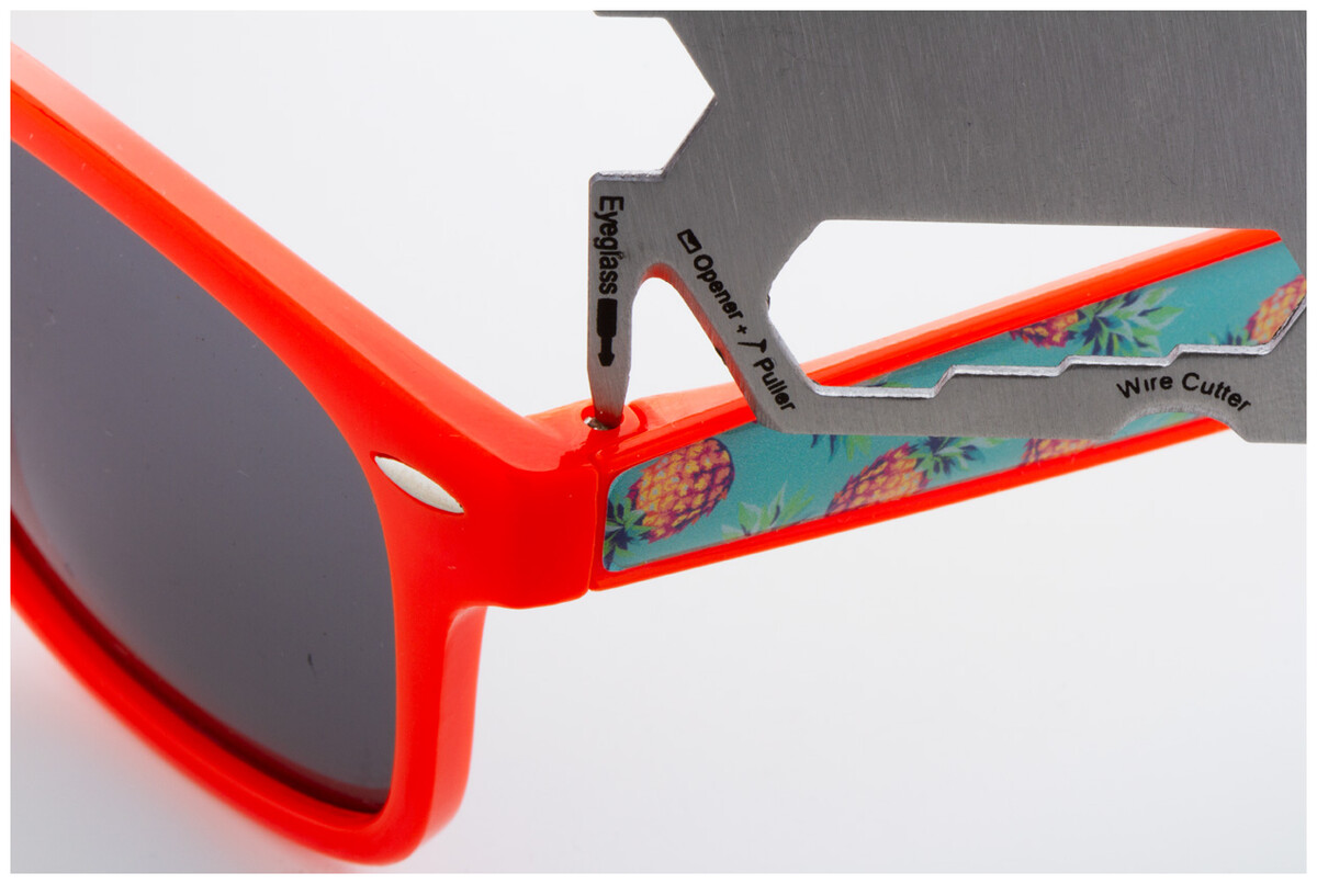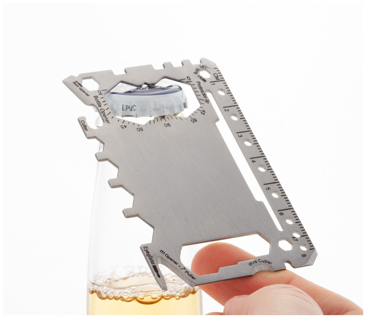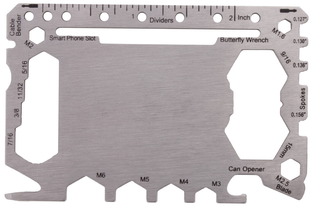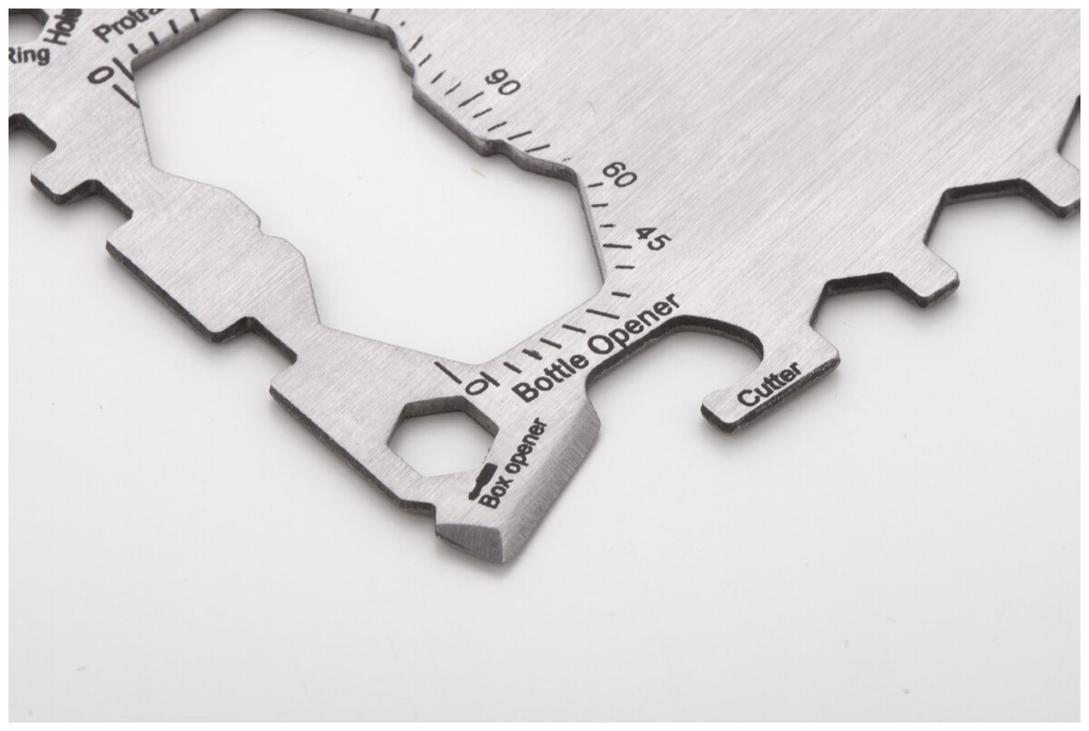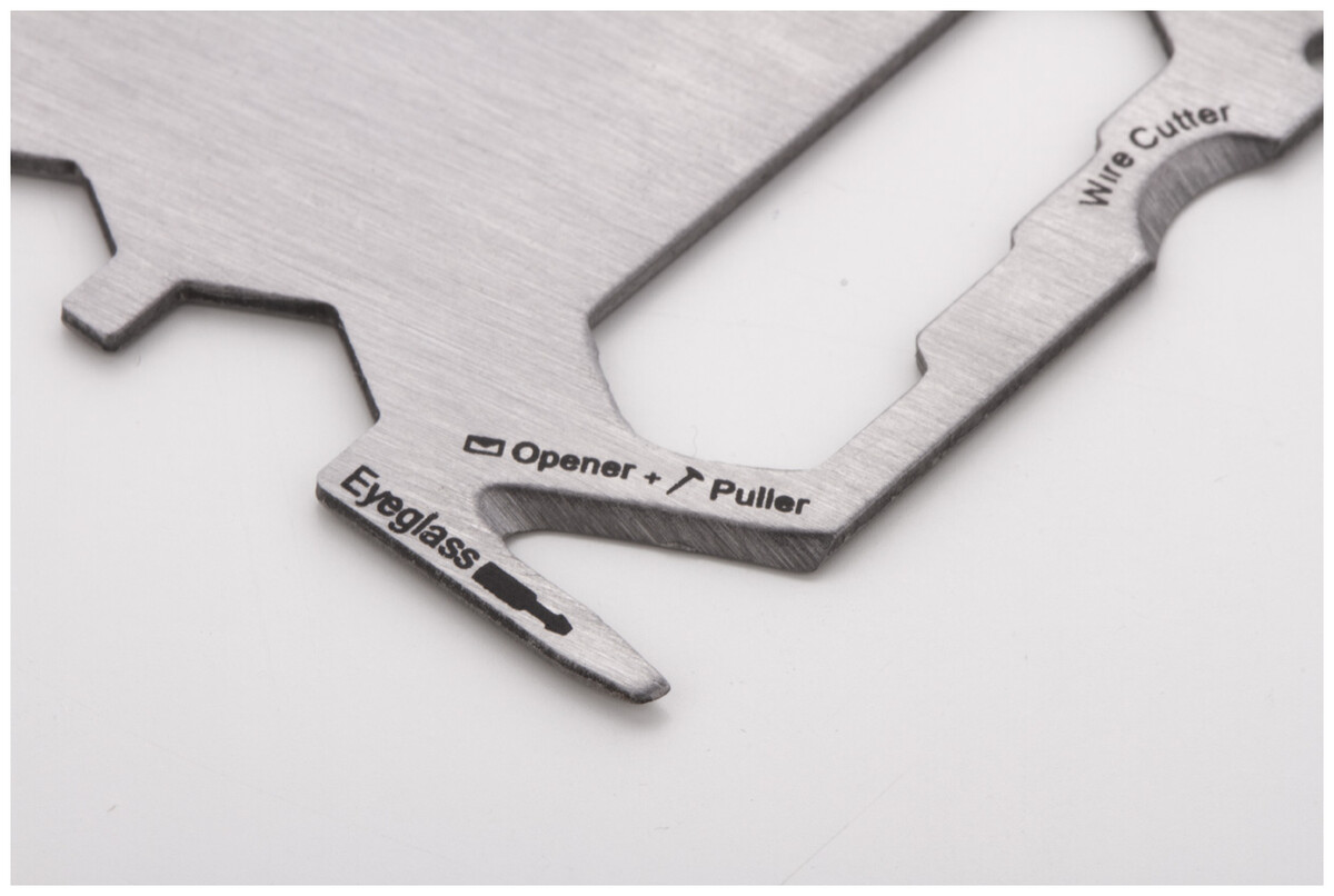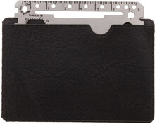 Multifunkční nářadí z nerezové oceli ve tvaru kreditní karty se 20 funkcemi, v pouzdře z PU kůže.