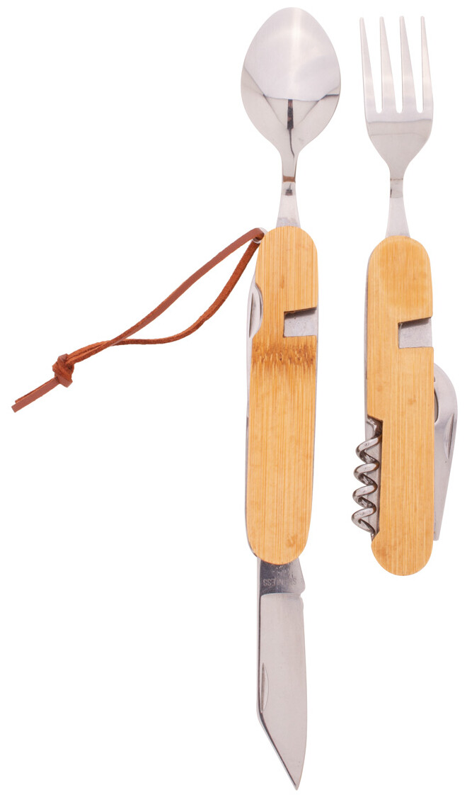 Nerezový multifunkční kapesní nůž a skládací příbory s bambusovou rukojetí a šňůrkou z PU kůže. Se 7 funkcemi: nůž, vidlička, lžíce, otvírák na láhve a konzervy, vývrtka a děrovač kůže. Při použití jako příbor se rozděluje na 2 části.