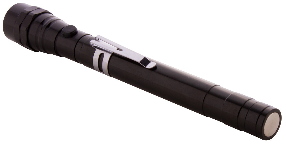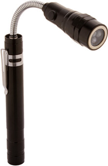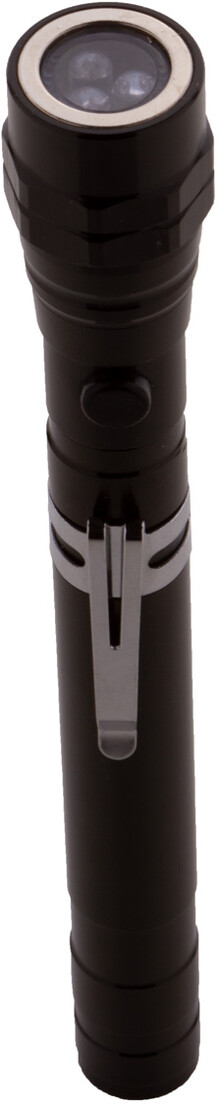 3 LED hliníková svítilna s výsuvnou a flexibilní hlavou, magnetem nahoře a kovovou boční sponou. Včetně knoflíkových baterií. Max. délka: 57 cm.