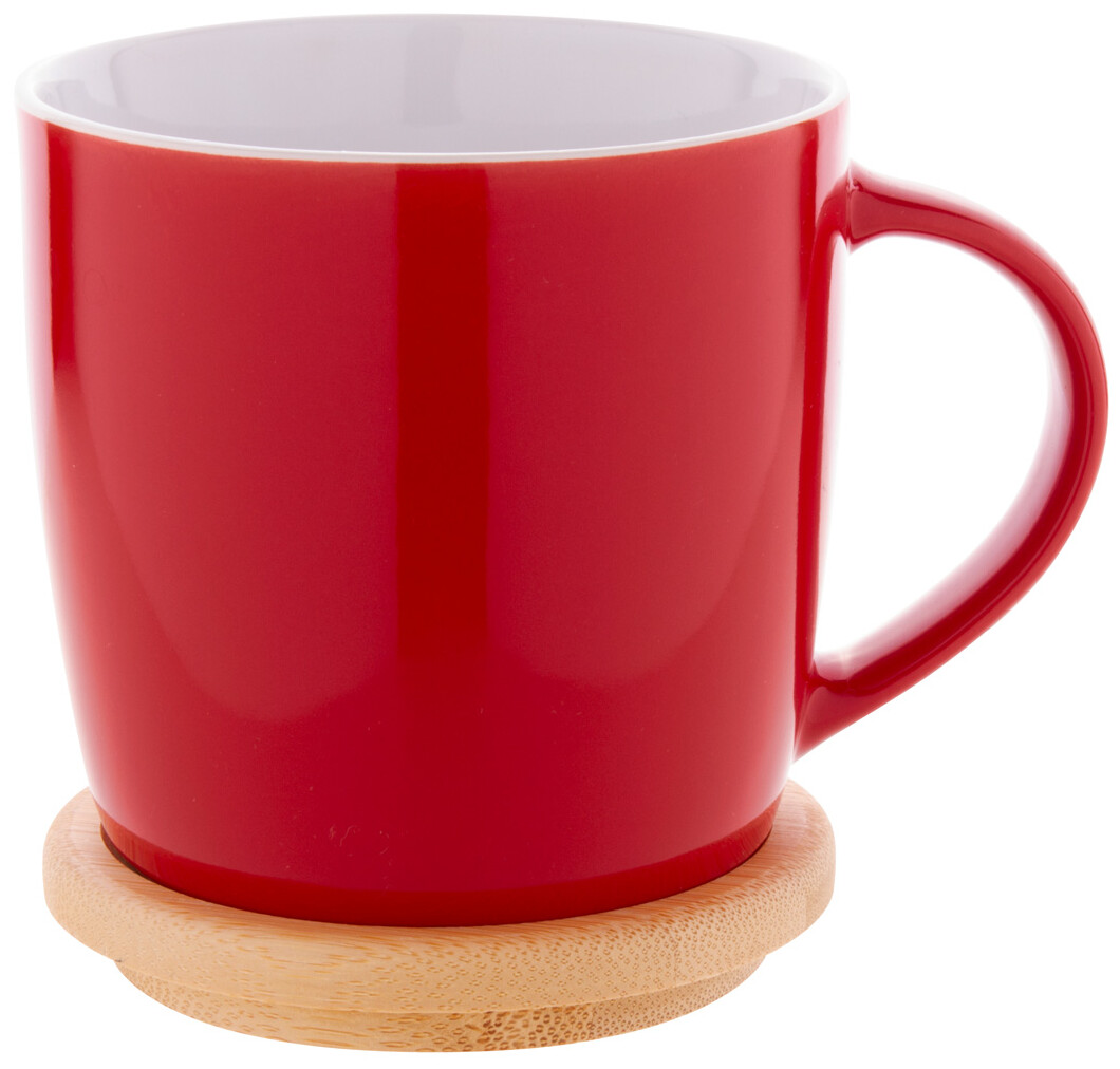 Vysoce kvalitní barevný keramický hrnek s bílým vnitřkem a bambusovým podtáckem, 370 ml. V kraftové papírové krabici.