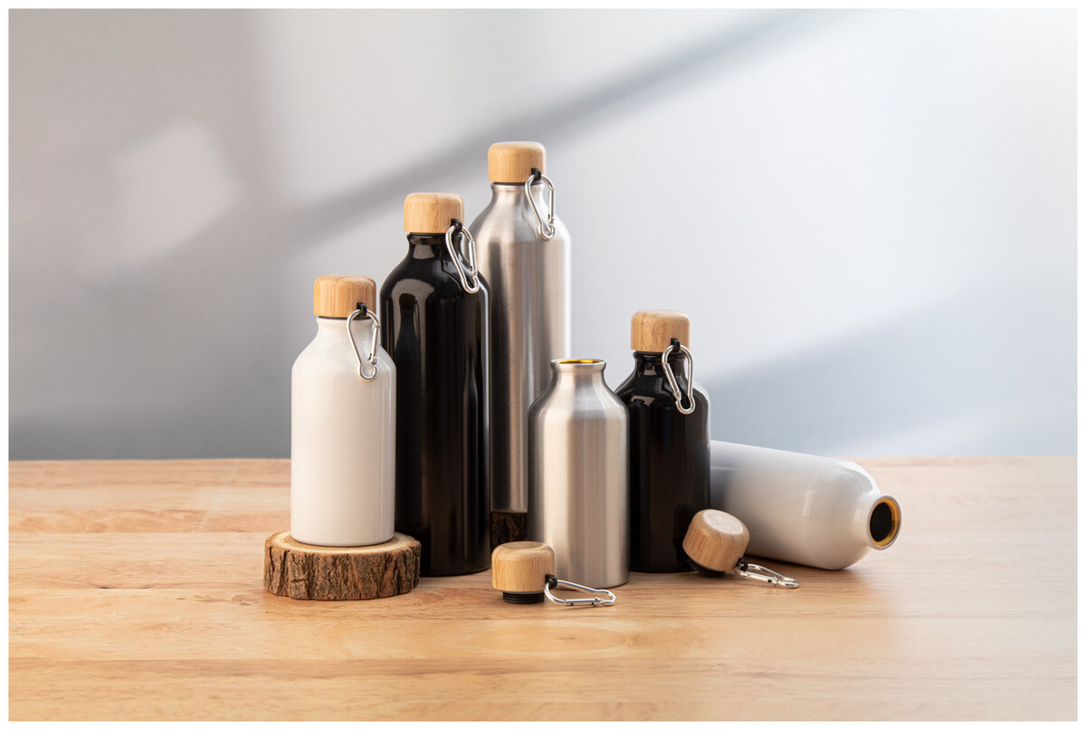 Hliníková láhev s bambusovým víčkem a karabinou, 400 ml.