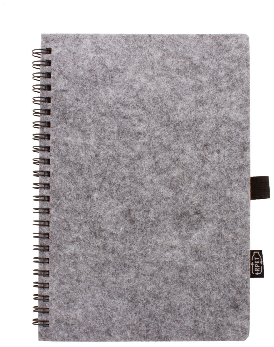 Spirálový blok A5 potažený RPET plstí s výrazným štítkem RPET a 80 linkovanými listy z recyklovaného papíru.