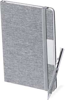 Blok A5 s deskami potaženými polyesterem 300D RPET se 100 linkovanými listy a gumičkou. Včetně kovového kuličkového pera potaženého polyesterem RPET s modrou náplní.