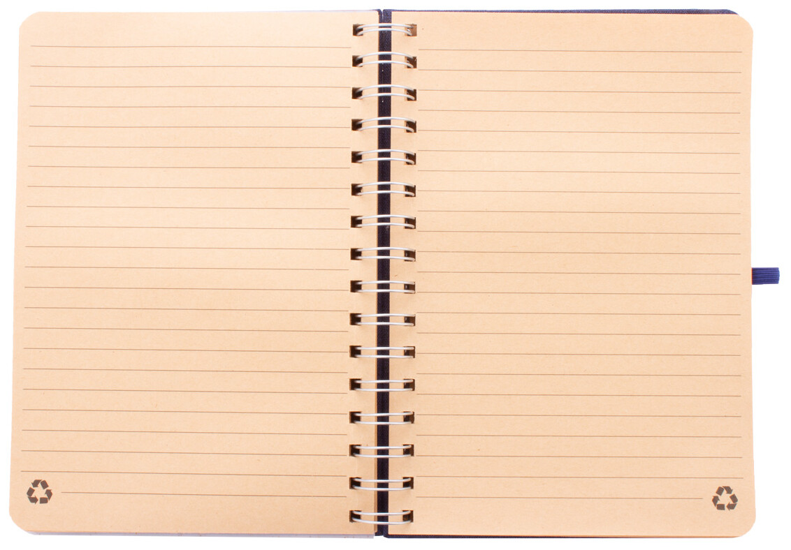Spirálový blok A5 s deskami potaženými polyesterem RPET s plastovým držákem na mobil a tablet z pšeničné slámy. Se 70 linkovanými listy z recyklovaného kraftového papíru, gumičkou a držákem na pero.